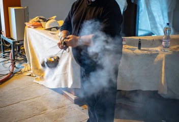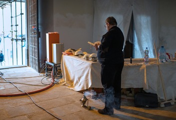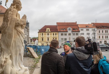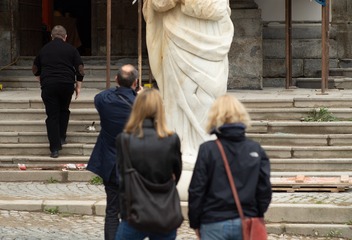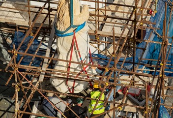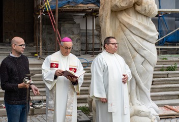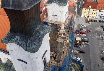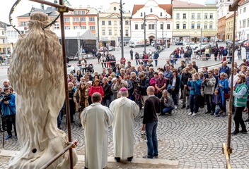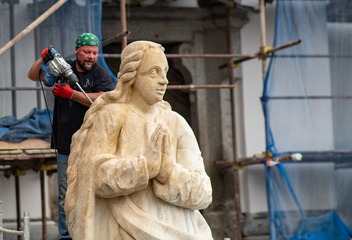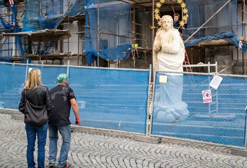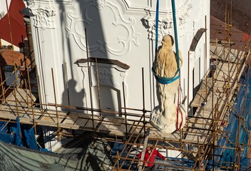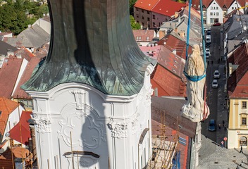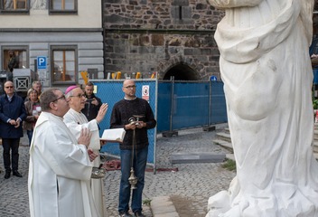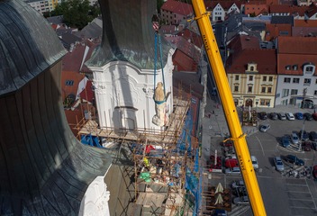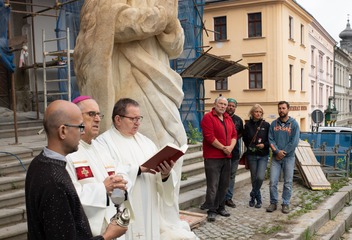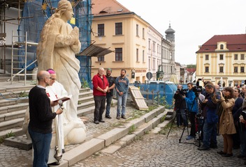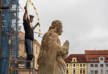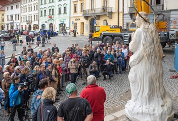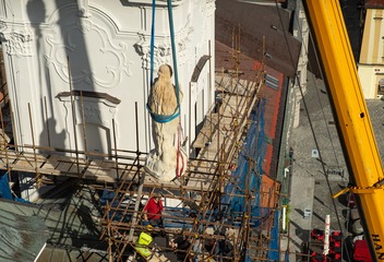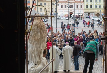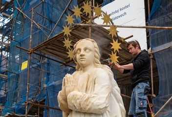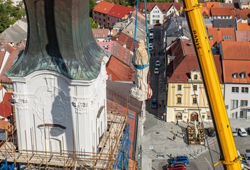Originální, téměř třímetrová socha z roku 1673, zůstávala na průčelí kostela až do srpna loňského roku, byla však už ve velmi špatném stavu – kostel opakovaně poničily požáry, na soše se negativně podepsaly také povětrností vlivy a další zásahy. Původní socha byla restaurována, na kostel se nyní vrátila její kopie. Vzhledem k rozsáhlému poškození originálu neměl sochař Tomáš Franta jednoduchou práci, na tvorbě věrné kopie pracoval asi půl roku.