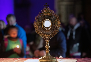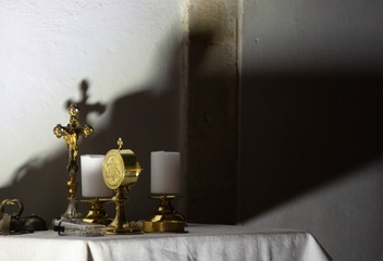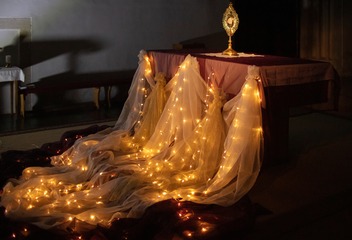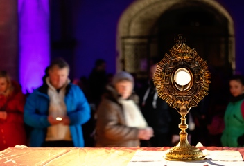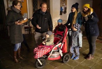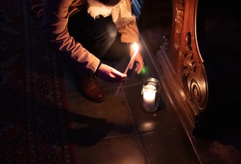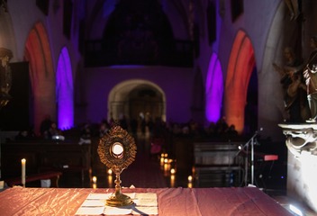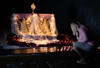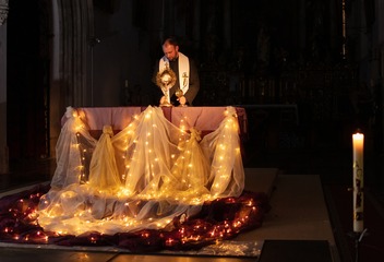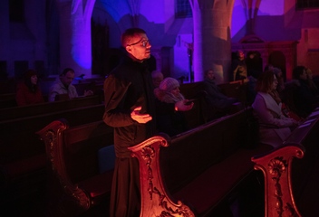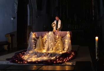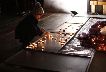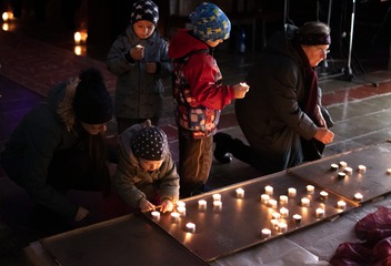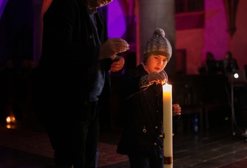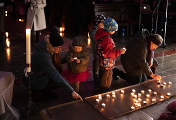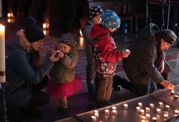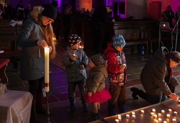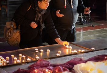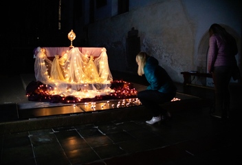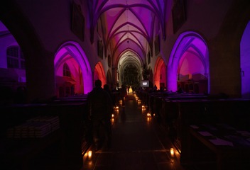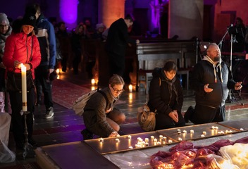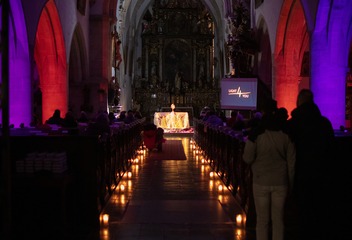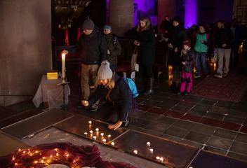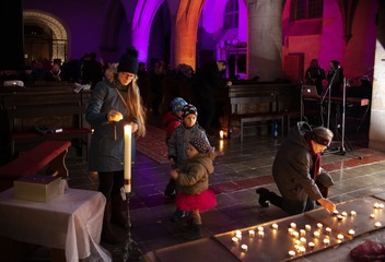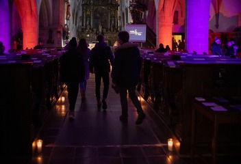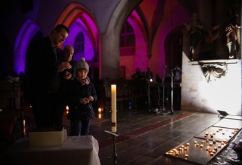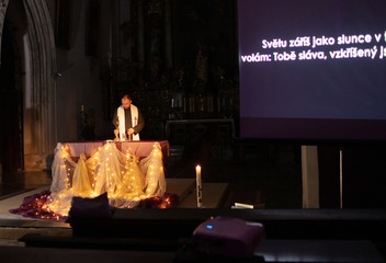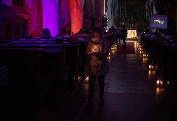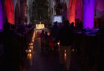 Lidé, přivítaní v otevřeném kostele Nanebevzetí Panny Marie, mohli zapálit svíčku, zastavit se, sledovat hru světel a stínů v chrámu.