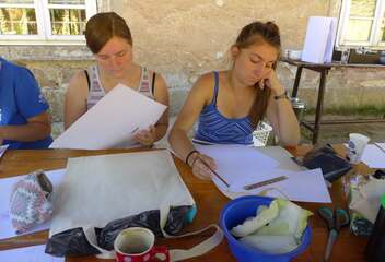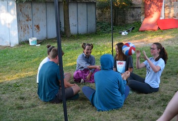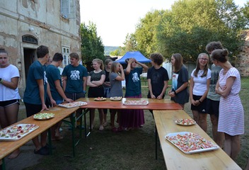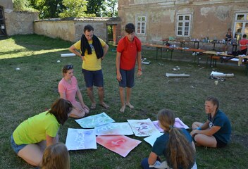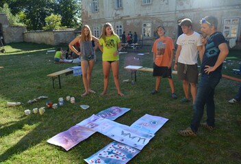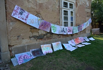 Pondělní odpoledne jsme strávili venku na výletu se svým gangem, krom toho, že jsme cestou plnili několik úkolů, především jsme se lépe poznali a spřátelili. V úterý se počasí nevyvedlo, tak jsme hráli jakousi vědomostně-pohybovou soutěž vevnitř. Přestože byla značně prostorově omezena, povedla se. Ve středu jsme si vyzkoušeli tanec s opravdovou tanečnicí a také jsme sami vymýšleli část choreografie. Pro mnohé z nás to bylo ze začátku nepřirozené, ale pak se tanec uchytil a trsalo se každý den, i když třeba jen při mytí nádobí. Ve čtvrtek na nás čekalo vyrábění vlastního spreje a jeho následné použití na čtvrtky, každý jsme si tak vytvořili svůj podpis. V pátek se konaly velké přípravy na večer, ale těch jsem se bohužel neúčastnila kvůli horečce. (Ovšem bylo o mě krásně pečováno naší kuchařkou a zdravotnicí Anežkou.)