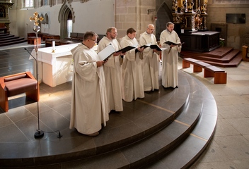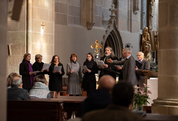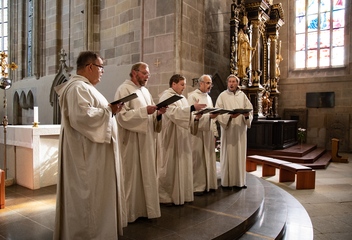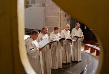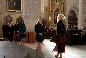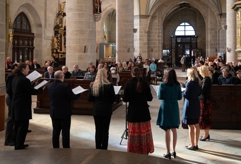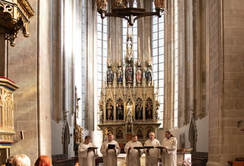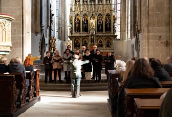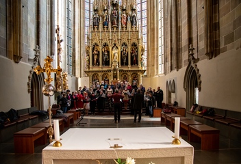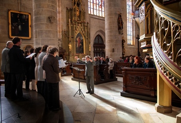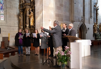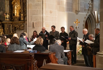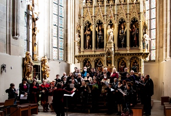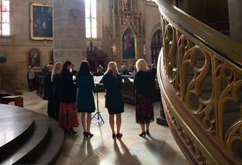 Jako vrchol tohoto dne se v 15:30 sbory spojily v jeden celek a naplnily prostor katedrály společnými 7 skladbami. Pro tento účel jsme zvolili hudbu rakouského Antonína Brucknera, mariánskou píseň Pozdravena buď Královno v aranži Víta Janaty, dále dvě Pange Lingua rakovnického regenschoriho a skladatele Josefa Omáčky, jako malé překvapení zazněla i jihoafrická modlitba I’Pharadisi, zaznamenaná švédským skladatelem Andersem Nybergem. A konečně píseň ke sv. Bartoloměji – Ouzká cesta, zkomponovaná mladým skladatelem Vítem Janatou z Prahy.