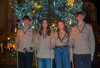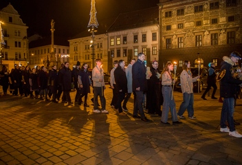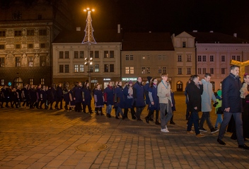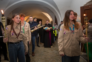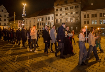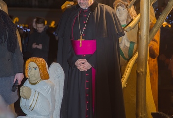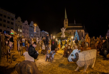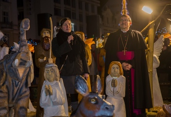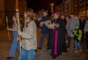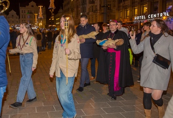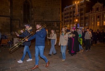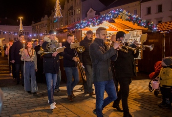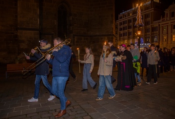 Za doprovodu žesťových nástrojů vyšel tradiční průvod od budovy biskupstvím kolem katedrály sv. Bartoloměje, přes Adventní trhy až k betlému.