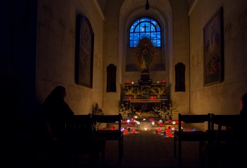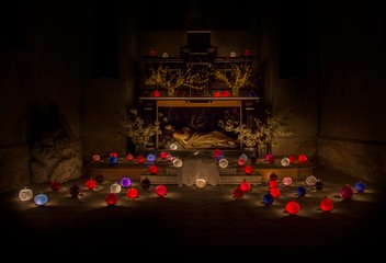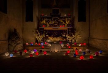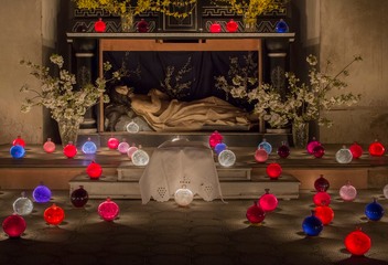 V následujícím roce jsme postavili náš první Boží hrob se skleněnými koulemi, i když podstatně prostším způsobem, než u našich německých sousedů. A stejně tak pokračujeme každé Velikonoce.Do koulí lijeme čistou vodu, ale i vodu s barevnými pigmenty. Protože v koulích bylo možné vypozorovat původní usazeniny červeného až modrého pigmentu, snažíme se dodržovat tuto barevnost, která zde zřejmě bývala zvykem. Když na Velký pátek večer postavíte koule před rozsvícené svíčky, rozzáří setajuplným světlem. Pak už jen stačí si sednout a v přítomnosti Nejsvětější Svátosti a tichu Božího hrobu pozorovat, jak přichází tma a koule září stále silněji.