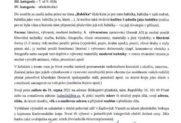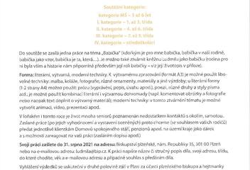 V loňském i letošním roce je život mnoha seniorů poznamenán nedostatkem kontaktů s okolím, samotou. Zaslané soutěžní práce (po jejich vyhodnocení a vystavení oceněných) proto chceme (se souhlasem vašich rodičů) předat klientkám Domovů spokojeného stáří, penzionů apod. na území Karlovarského a Plzeňského kraje jako dárek, s možností zareagovat na vaši práci např. zasláním dopisu atp.